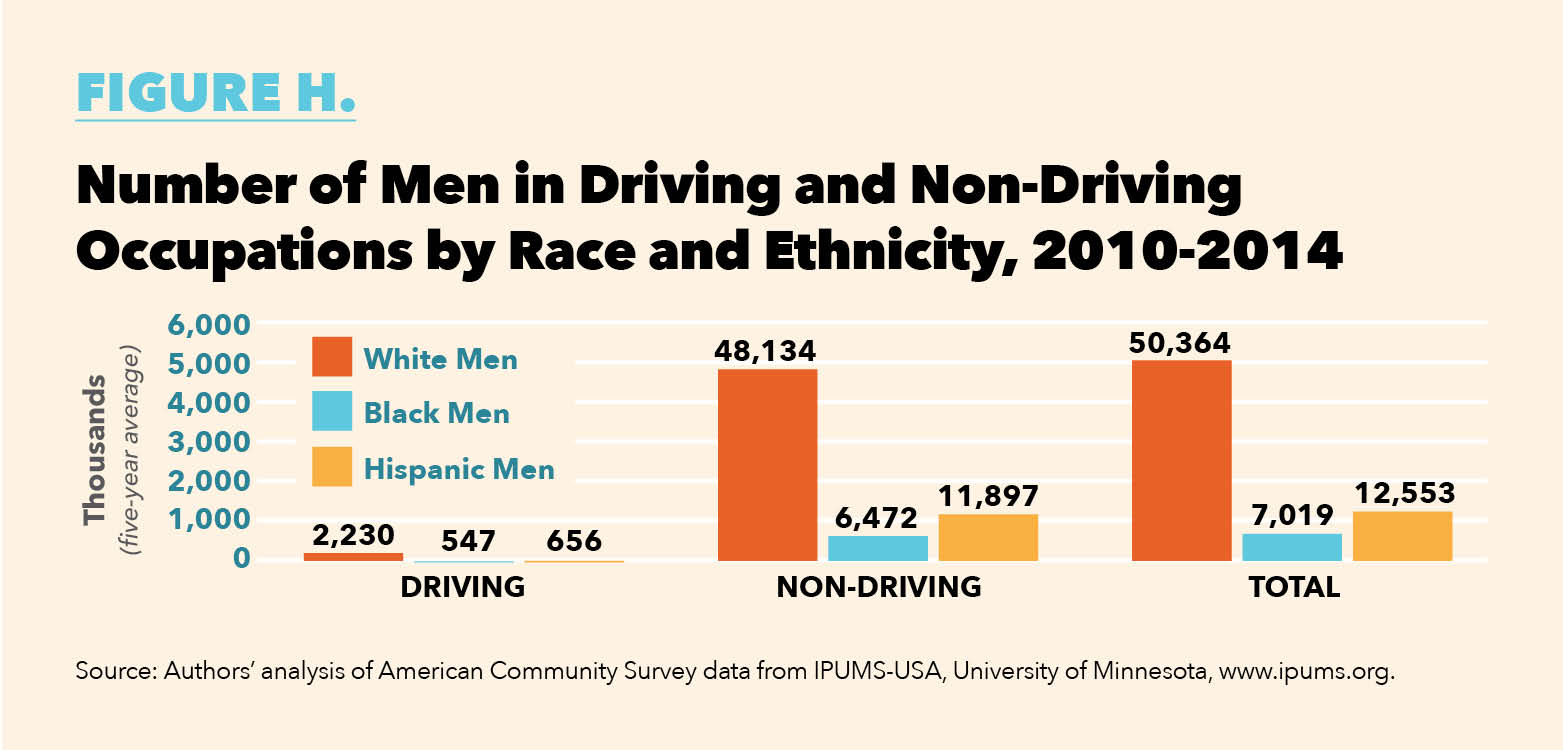 Figures G and H show the breakdown between White, Black, and Hispanic men by driving occupations, and by type of occupation, respectively. White men vastly outnumber Black men in delivery driver and heavy truckingoccupations (about five to one), but not for bus drivers (about two to one), or taxi drivers and chauffeurs (about 1.7 to one). There are about four times as many White men in driving occupations than Black men, but about 7.5 times as many White men in non-driving occupations.