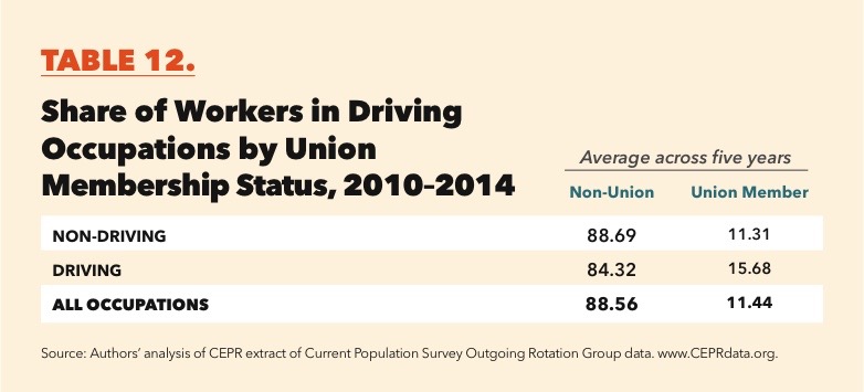 Larger shares of workers in driving occupations (15.68 percent) are union members, compared with workers in non-driving occupations (11.31 percent). In total, only 11.44 of workers overall are union members.