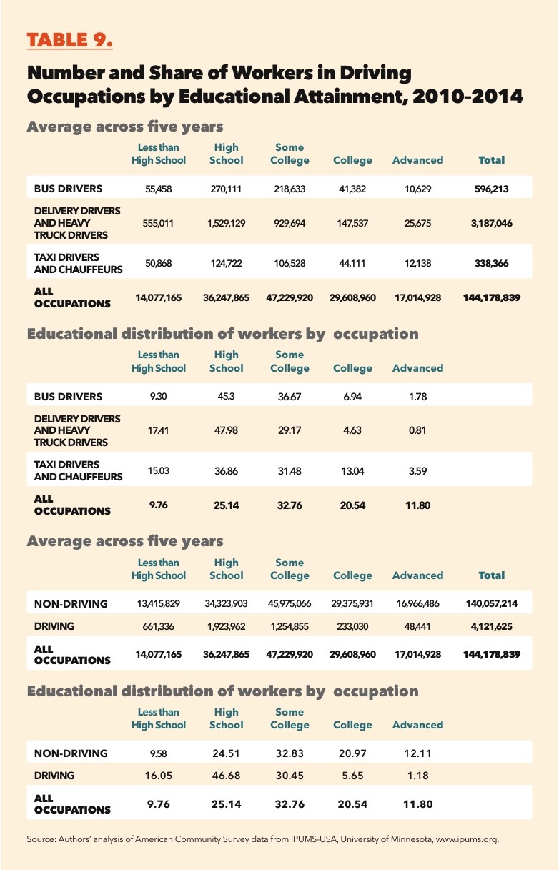 Table 9 shows the educational distribution of workers by occupation (see figures L and M as well). Generally, workers in driving occupations are more likely than workers in non-driving occupations to have less than a bachelor’s degree. Among workers in driving occupations, 93.17 percent have less than a college degree, compared with 66.91 percent of workers in non-driving occupations. Compared to the overall workforce, those in driving occupations are significantly overrepresented at the high school diploma level (25.14 percent of the overall workforce and 46.68 percent of the driving workforce). Correspondingly, these driving occupations are significantly underrepresented at the college and advanced education levels. Driving occupations represent a significant source of work for those with lower levels of educational attainment.
